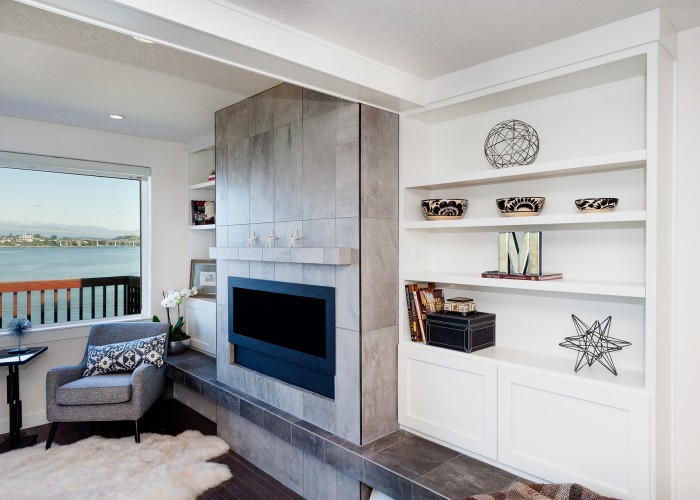 The original designed fireplace and bookshelves combination is part of a major remodel.